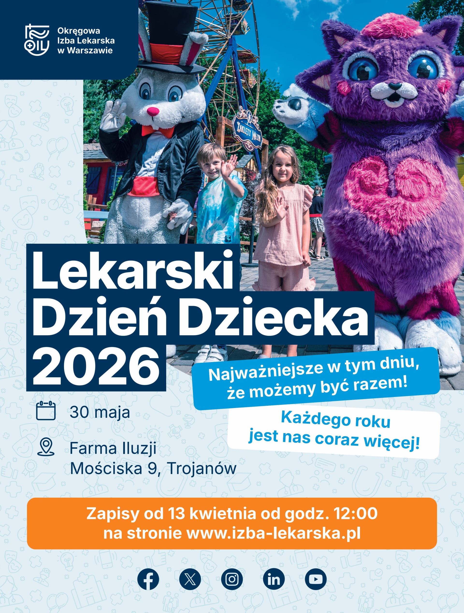 Już 13 kwietnia o 12:00 startują zapisy na jedno z najbardziej wyczekiwanych wydarzeń dla lekarskich rodzin. Tegoroczny Lekarski Dzień Dziecka odbędzie się 30 maja w niezwykłej scenerii – w Rodzinnym Parku Rozrywki Farma Iluzji w Trojanowie.